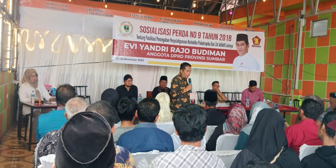 SUMBARBERKABAR.COM – Sosialisasi terkait Peraturan Daerah (Perda) Nomor 9 Tahun 2018 tentang fasilitasi penanganan dan pencegahan narkoba mendapat dukungan penuh dari Evi Yandri Rajo Budiman, anggota DPRD dari Fraksi Gerindra.